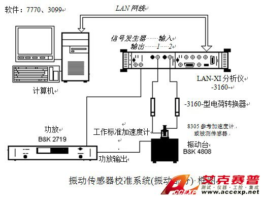 長沙艾克塞普儀器設備有限公司根據用戶的振動傳感器校準需求,長沙艾克塞普儀器公司首席產品應用工程師Tony.Lee特采用丹麥BK公司設備,搭建了以3160分析儀為平臺的震動傳感器校準系統,BK3160通過安裝在PC中的分析及校準軟件(7770、3099)控制,從信號發生器通道輸出正弦或隨機信號,經2719型功放進行功率放大,然后驅動BK 4808振動臺產生指定波形和幅度的振動,振動的大小通過安裝在校準夾具內的工作標準加速度計(4371)檢測,并反饋到分析儀的輸入通道。同時,被測加速度計(或8305型參考加速度計)也感受到相同的振動,并將信號輸入分析儀。加速度計輸出的信號需經2647型電荷放大器轉換為分析可接收的電壓。最后,將“被測”與“標準”兩路信號的測量結果進行比對,即可得到被測傳感器的靈敏度等參數,從而實現傳感器校準。