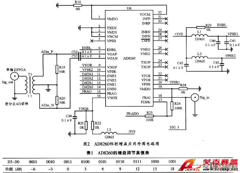 圖2所示是AD8260的外圍電路,其中AD8260芯片采用±5 V雙電源供電,也可以通過跳線實現(xiàn)+3.3V單電源供電。即將-5VS接地,R21焊接,R22斷路,+5VS接+3.3 V。