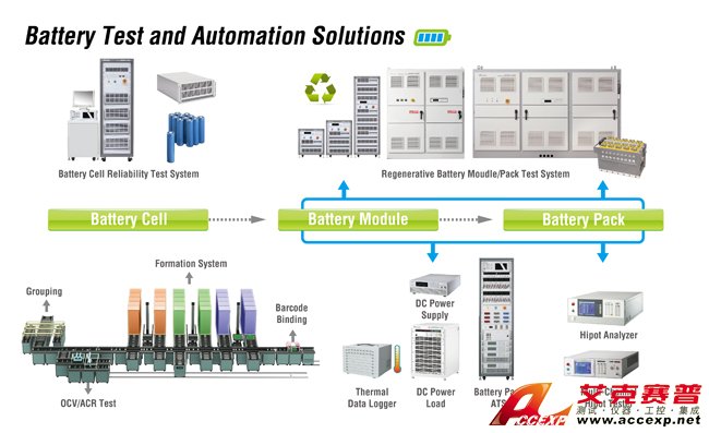 Accexp代理的Chroma 將在將電力電子產業耳熟能詳的8000系統的成功經驗轉移到電池應用領域,開發電池產業專用的測試項目(Test Item),可進行電池管理系統(BMS)的自動化測試。Chroma Model 8700系統具備靈活的硬體架構,針對電池業界產品高度客制化與多樣化的測試需求的現狀,可擴充硬體與增加新測試項目,并支援多種硬體,例如直流電源供應器、電子負載、LCR表、六位半數位電表等,透過不同硬體配置,可符合不同應用的自動測試需求。