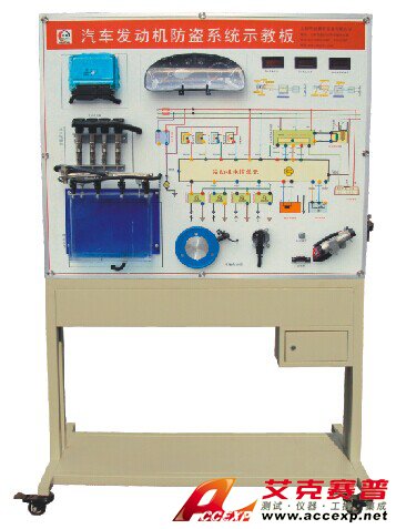 發動機電控單元、防盜控制單元、防盜鑰匙、發動機各類傳感器、發動機各類執行器、檢測端子、故障設置系統、大容量蓄電池或12V開關電源、大型彩色噴繪電路原理圖、控制面板、可移動臺架、使用說明書及任務驅動式實訓指導書等。