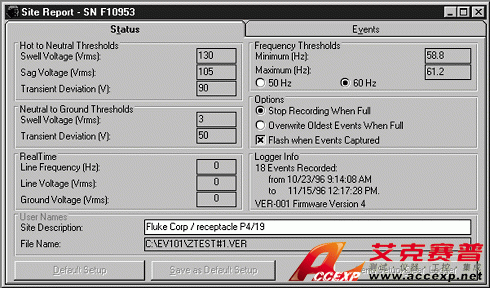 用戶可以將數據從記錄儀中取出來,將其備份到計算機。EventView軟件可以下載記錄儀插入到插座期間記錄到的完整的事件記錄。利用該軟件,用戶可以創建包括驟降、驟升、瞬態現象、斷電和頻率漂移等事件的詳細報告,并具有時標。PC和VR101的通信是通過光纜實現的。也就是說PC和VR101記錄儀是隔離的,非常安全。事件記錄儀有一節可使用7年的鋰電池供電,所以不受電源斷電的影響。每一VR101記錄儀都有其自身的實時時鐘,用于對電壓事件加時標,并且由工廠同一分配的代碼識別。利用其時鐘和ID代碼,在工廠內可放置多個記錄儀,從而獲得完整的電能質量布局。