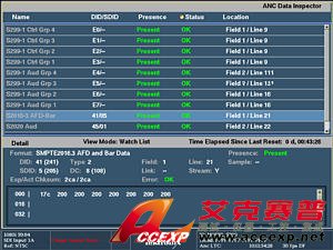 可以檢測和解碼多種ANC 數據,包括AFD、WSS、視頻索引(Video Index)、TSID、V-Chip、廣播標志/CGMSA、VITC、LTC 和ANC TC 等