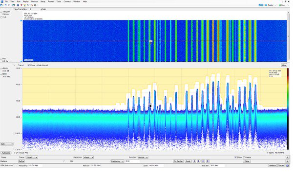 播放記錄的信號可以把觀察等待頻譜違規的時間從幾小時縮短到幾分鐘,您可以在桌面上復核記錄的數據。記錄長度只受存儲介質容量限制,記錄是SignalVu-PC中標配的基本功能。SignalVu-PC應用SV56播放可以全面分析所有SignalVu-PC 測量數據,包括DPX三維頻譜圖。在播放過程中保持最短信號時長指標??梢詧绦蠥M/FM音調解調。提供了可變頻寬、解析帶寬、分析長度和帶寬??梢栽谟涗浀男盘柹蠄绦蓄l率模板測試,支持最高40 MHz頻寬,模板違規操作包括蜂鳴、停止操作、保存軌跡、保存圖像、保存數據??梢赃x擇并循環播放的各個部分,重復考察關心的信號。播放可以是無隙的,也可以插入時隙,縮短復核時間。實時速率播放保證了AM/FM解調的保真度,提供了與實際時間1:1播放。記錄的時鐘時間在三維頻譜圖標記中顯示,與真實世界事件相關。在下圖中,正在重播FM頻段,使用一個模板檢測頻譜違規,同時偵聽92.3?MHz中心頻率的FM信號。