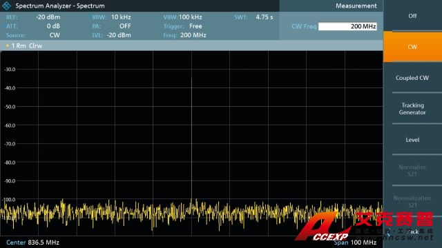 R&S FPC1500 可以在獨(dú)立模式下使用集成式信號(hào)源。由于具備這種獨(dú)特功能,R&S FPC1500 可用作連續(xù)波 (CW) 信號(hào)發(fā)生器。信號(hào)源可用作本振信號(hào)以進(jìn)行混頻器測量,或用作輸入信號(hào)以進(jìn)行放大器增益測量。