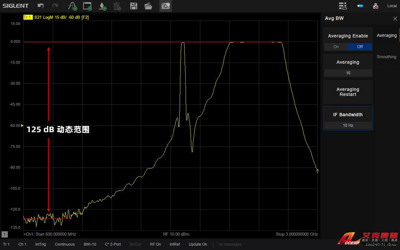 系統動態范圍是VNA一個非常重要的指標,它是VNA源的最大輸出功率與測試端口本底噪聲的差值。鼎陽SIGLENT SNA5082X矢量網絡分析儀的動態范圍可達125dB@10Hz IFBW,接收機噪底-125dBm/Hz,可適用于對動態范圍要求比較高的測試場景,比如同時測量濾波器的通帶和帶外抑制性能。