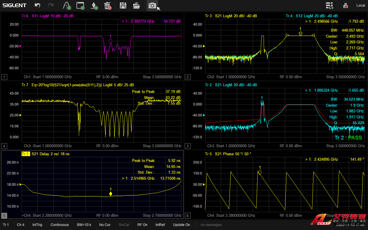 鼎陽SIGLENT SNA5082X矢量網絡分析儀支持在多個窗口添加多條跡線進行全4端口S參數測試,并且具備多種顯示格式,比如 Log Mag,Lin Mag,Phase,Delay,Smith,SWR,Polar等,可以方便快捷地分析被測物的傳輸系數,反射系數,駐波比,阻抗匹配,相位,延時等參數。在生產線驗證天線,濾波器等的特性時,還可以保存參考跡線或者添加Limit模板進行通過失敗測試,有利于提高生產效率。
