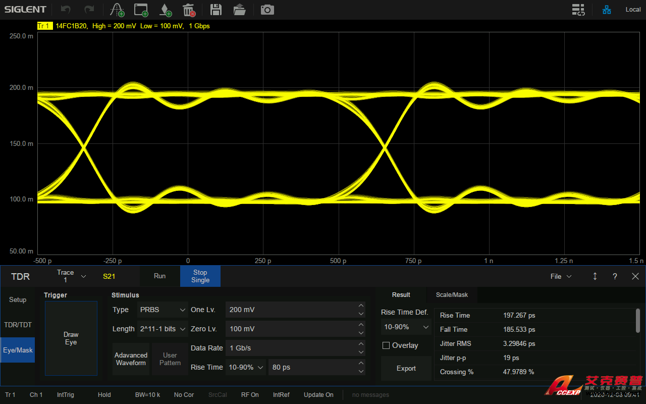 鼎陽SIGLENT SNA5082X矢量網絡分析儀搭載了眼圖功能,眼圖可以反映信號鏈路上傳輸的數字信號的整體特征,從中觀察出碼間串擾和噪聲的影響,進而估計系統的優劣程度。眼圖分析是高速系統信號完整性分析的核心,為需要對高速信號進行時域分析的客戶節省了大量成本和時間。