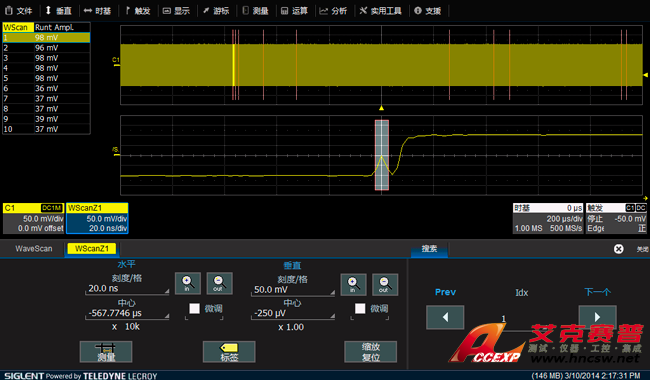 WaveScan被稱為示波器中的Google, 能夠?qū)崟r(shí)地對(duì)采集到的波形進(jìn)行測(cè)量分析,搜索出感興趣的信號(hào),可對(duì)搜索到的信號(hào)進(jìn)行列表顯示、高亮標(biāo)識(shí)和放大觀察,可以靜態(tài)地“查找”,也可以動(dòng)態(tài)地“掃描”。