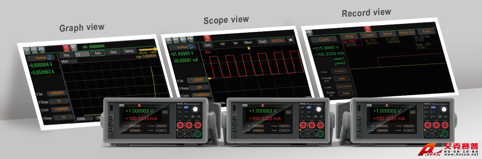 IT2800系列SMU的前面板有許多功能,以提高交互式使用的速度,用戶友好性和易操作性。這些功能包括5英寸彩色LCD觸摸顯示屏,USB 2.0 memory I/O端口、一個旋轉導航按鈕、trigger按鍵、功能按鍵以及主流的香蕉插座。USB2.0內存端口支持輕松的數據存儲,測試配置文件導入以及系統升級。IT2800提供圖形化和數字化兩種測量結果顯示模式,直觀的Graph view,Scope view以及Record view視圖,極大地提高了臺架測試和I-V特性分析的效率。