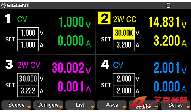 SPD4000X系列支持 4W Sense 模式,能自動補償正負輸出線的壓降,保證遠端待測設備得到電壓等于電源設置電壓,在高精度的測試或者線纜很長的場合可以發揮重要作用