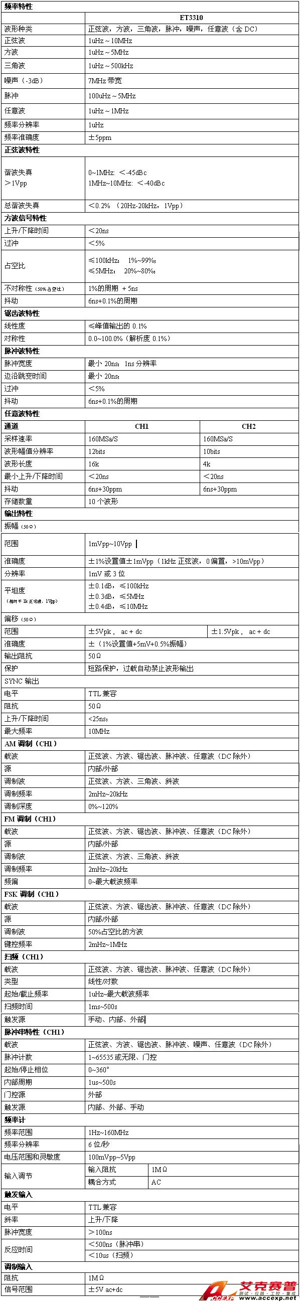 艾克賽普-ET3310雙通道函數(shù)/任意波形發(fā)生器技術(shù)參數(shù):
