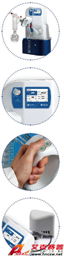 快速、穩(wěn)定和易用。 提供良好的分離,濃縮和純化解決方案。 Strike 280 配備計(jì)時(shí)器,程序控制,自動(dòng)提升等功能。 更多的安全措施,包括:過(guò)熱設(shè)置和保護(hù),斷電時(shí)自動(dòng)起升,實(shí)時(shí)監(jiān)測(cè)蒸汽和冷卻水溫度等。