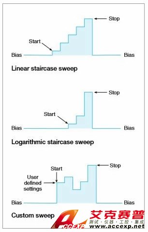 掃描方案采用自動化鉤子(hook)極大加快 了測試。三種基本掃描波形可設置為單事件或連 續工作,因而非常適于I/V、I/R、V/L和V/R特性分 析。