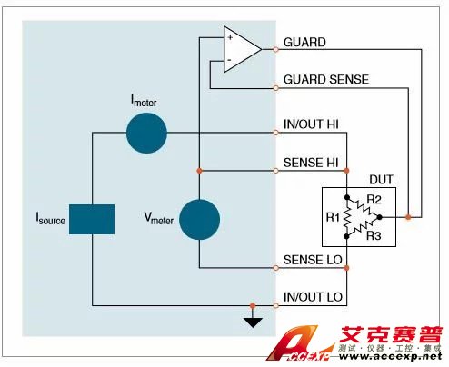 數字源表能進行標準4線、分裂Kelvin以及6線、帶防護的電阻測 量并且能配置為恒流或恒壓方法。6線測量方法: